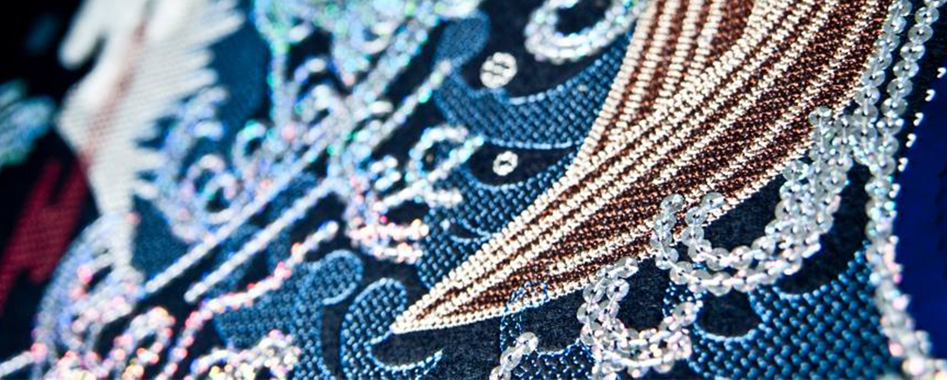 This machine combines both standard and special equipment, embroideries in “foam” or “loop” stitches and chain stitches.